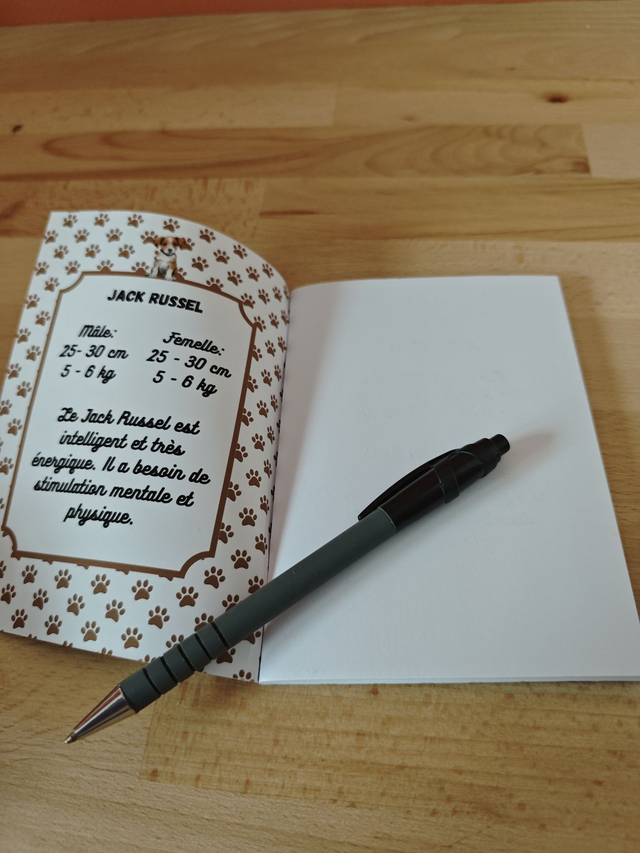 Vous pourrez prendre des notes partout ou que vous soyez. Ce carnet est composé de 60 pages blanches de 80g. La couverture est réalisé dans un papier épais de 250g et décoré devant et derrière de la même façon. A l'intérieure vous trouverez un petit récapitulatif des caractéristiques de la race
